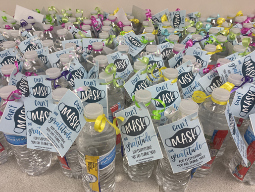 flavoring and water bottles to Carle Foundation Hospital Radiology tagged with “Can’t Mask Our Gratitude.” Director Kelly Oppe, MBA, RT® said, “Over the last couple of years, our team has experienced challenges both personally and professionally. The token of appreciation rehydrated our spirits and lightened our day.”Human Resources initiated the idea that took off among the departments. “Our team members are so amazing,” Lauren Schmid, executive vice president and chief Human Resources officer, said. “The outpouring of support our teams are extending to one another through this program is overwhelming and reflects the values we strive for each day.”