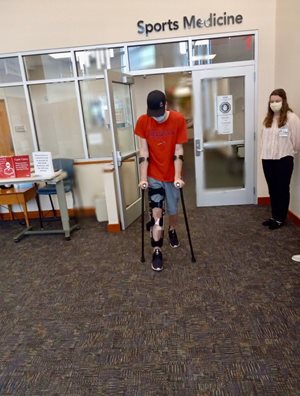 In the beginning stages of his physical therapy, Potter wore a leg brace and needed crutches to get around. He worked with Martindale on whatever he could, including gentle range of motion techniques and light hip and quad exercises.