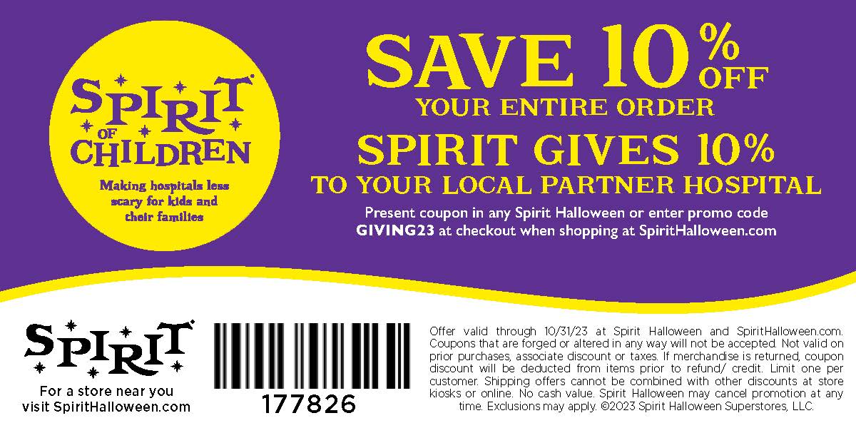 If you would like to support the annual Spirit of Halloween fundraiser, download a 10-for-10 coupon. With the coupon you can save 10% off your entire order in store at your local spirit Halloween store and Spirit gives that 10% to Carle Health Methodist Hospital Child Life Program.