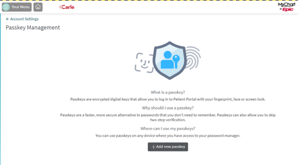 Passkey is a secure way to log into your MyCarle account, without having to use a username or password. Passkey uses facial recognition or a fingerprint scan to log you in. (Fingerprint scans are only used on specific devices: Samsung, older-generation iPhonesolder-generation iPads.)