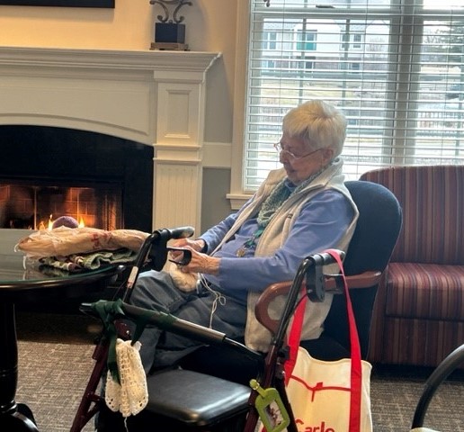Groups like the knitting club are also open to residents looking to try a new activity for the first time. Resident Pat Moore became interested in knitting after her daughter shared projects of her own. Although Pat says she is a novice, she enjoys knitting with the group, chatting about their lives and families.